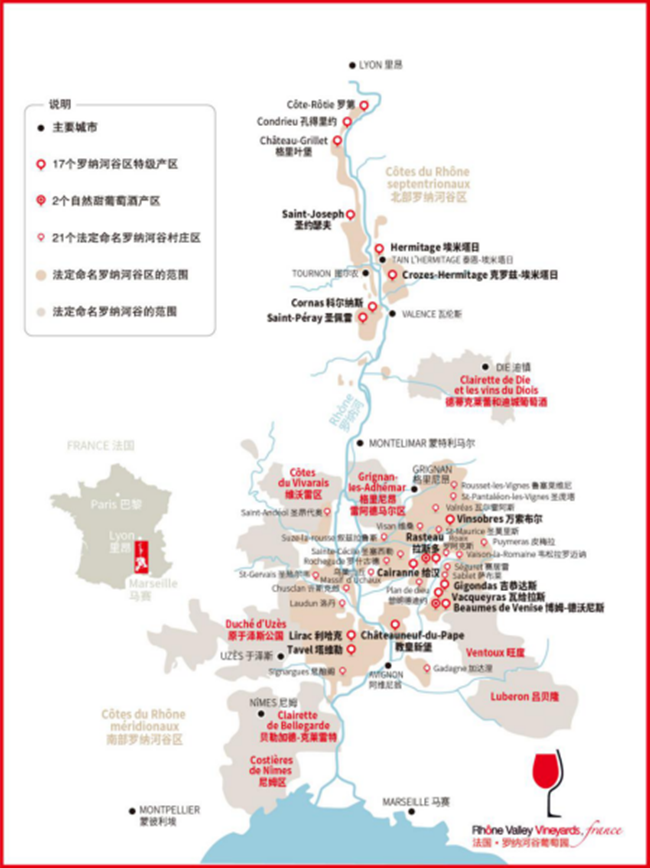 以蒙特利馬爾鎮(Montelimar)為界,沿羅納河綿延250公里的羅納河谷葡萄園被分成南北兩部分——北羅納河谷葡萄園(Northern Rhone Valley Vineyards)和南羅納河谷葡萄園(Southern Rhone Valley Vineyards)。不過,盡管都被冠以“羅納河谷”之名,但這兩部分卻仿佛同一位母親的兩個性格迥異的孩子,在氣候、土壤、葡萄品種以及葡萄酒風格等方面千差萬別,甚至常常被當作兩個不同的產區來對待。再加上南、北羅納河谷葡萄園各自內部眾多更為細分的子產區,共同造就了羅納河谷葡萄園和它所出產的葡萄酒豐富的多樣性。