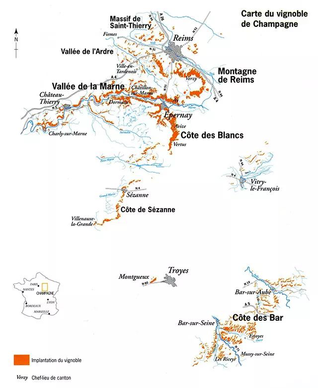 主要分布在蘭斯山區(qū)La Montagne de Reims、白坡La Côte des Blancs、馬恩河谷La Vallee de la Marne、巴爾坡地La Côte des Bar。