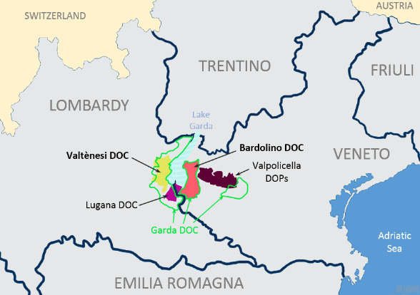 隸屬于威尼托大區(qū)維羅納省的巴多利諾(Bardolinoi)市,距離維羅納市西北約25公里,距離威尼斯以西約130公里,處于加爾達(dá)湖(Garda)東岸,北靠阿迪杰山谷(valle dell’Adig),西至明喬河(Il Mincio )。巴多利諾的中南部地區(qū)有一系列狹長(zhǎng)的山丘,地區(qū)海拔差異在50-100米之內(nèi),部分洼地中分布有泥炭沼澤。