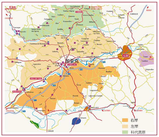 加亞克的3大主要子產區分別為右岸(Rive Droite)、左岸(Rive Gauche)和科代高原(Plateau Cordais)。其中位于塔恩河(Tarn River)以南的右岸產區地勢高,可俯瞰整個塔恩河。該產區的葡萄園以黏土和石灰巖土壤為主,出產著優質的莫札克和布洛可。其中由莫札克釀成的酒既有優雅柔順且回味悠長的干型白葡萄酒,又有芳香馥郁的甜酒,而布洛可紅葡萄酒則充滿水果和香料風味。塔恩河以北的左岸產區地勢較低,以鵝卵石、砂土和礫石為主,有著孕育優質紅葡萄酒的杰出風土。這里出產的杜拉斯紅葡萄酒風格強勁有力、單寧圓潤,而白葡萄酒雖不比右岸的脆爽,但采用蘭德樂釀成的白葡萄酒卻有著出色的復雜度。此外,該產區還出產著品質優異的遲摘(Late Harvest)葡萄酒。位于加亞克北部的科代高原以石灰巖為主,其出產的白葡萄酒擁有清新的花香和果香,紅葡萄酒口感平衡、適宜陳年,桃紅葡萄酒果味芳香、酒體輕盈。