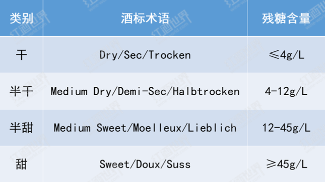 人們根據酒液中的殘糖量將靜止葡萄酒分成了四個類別:干型(Dry)、半干型(Medium Dry)、半甜型(Medium Sweet)和甜型(Sweet)。