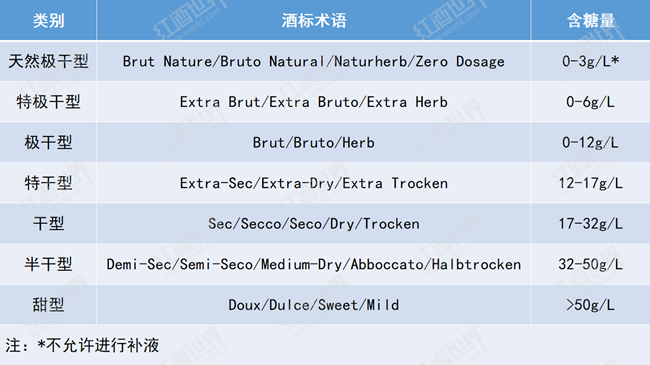 以上的分類方法主要適用于靜止葡萄酒,而起泡酒的含糖量分類與靜止葡萄酒不同,也更為細化,具體可參照下表。