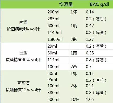 那么,不同的血液酒精濃度對應多少酒呢?