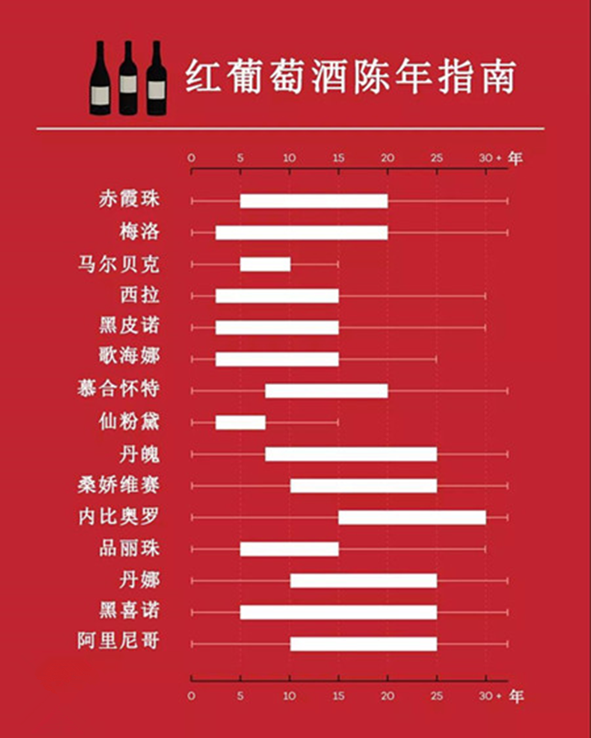 以上紅葡萄酒的陳年影響因素與葡萄品種本身有很大的關(guān)系,以下是一個(gè)簡潔版的紅葡萄品種的陳年指南,僅供參考: