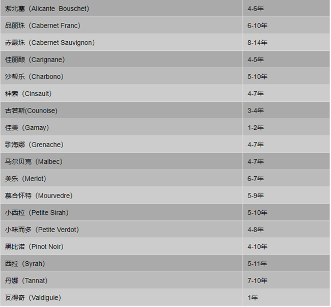 然而,即使是在超市里面,我們還是能夠輕易買(mǎi)到具備陳年潛力的葡萄酒,特別是紅葡萄酒(當(dāng)然這些酒大多價(jià)格不菲)。具體而言,一瓶葡萄酒的陳年潛力基本上取決于其葡萄品種,不同的葡萄品種其“適飲期”也大不一樣。以下是一份各主要紅葡萄品種的適飲期指南,可供各位葡萄酒愛(ài)好者參考: