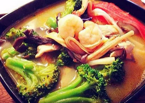 這是一道泰國(guó)名湯,世界十大名湯之一,將輔料放入桶煲至出味,而后放入大頭蝦、草菇、椰汁等一起燉煮,酸味鮮美開胃。這湯以色澤全紅、湯味馥郁可口而著稱。