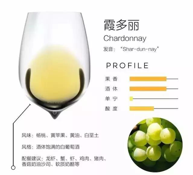 霞多麗是一款源自法國的干型、飽滿的白葡萄酒。經(jīng)過橡木桶熟成的霞多麗會(huì)有奶油和黃油的味道。
