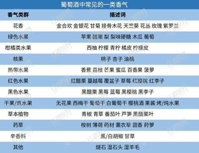 葡萄酒的一類香氣為葡萄品種自帶的香氣和酒精發(fā)酵過(guò)程中產(chǎn)生的香氣,主要表現(xiàn)為葡萄酒中各類新鮮的花香、果香和草本香氣等,這些香氣在不同產(chǎn)區(qū)的氣候條件下也會(huì)展現(xiàn)出不同的側(cè)重點(diǎn)。一款簡(jiǎn)單易飲的葡萄酒通常只會(huì)展現(xiàn)出有限的一類香氣,且往往都是來(lái)自同一類群的香味,如熱帶水果香氣或者柑橘類果香。而一款復(fù)雜的葡萄酒通常會(huì)展現(xiàn)出不同類群的香氣,如同時(shí)帶有紅色水果、黑色水果和草本植物的香氣。