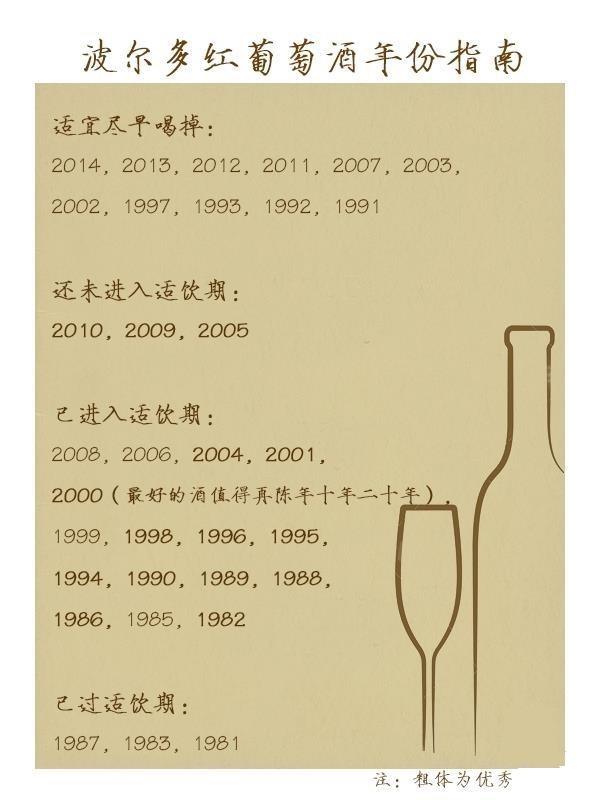 葡萄酒酒標上的年份,代表的是釀這瓶酒所用的葡萄采摘的年份,包括了當年的光照、雨水、溫度等各種因素。下面來著重了解下波爾多葡萄酒酒標上的年份。