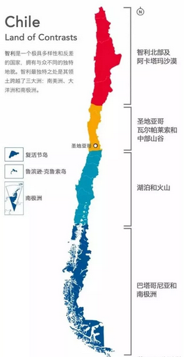 智利是世界上地形最狹長的國家,由于從北到南,跨度較大,從而形成了 4 個大產(chǎn)區(qū)!