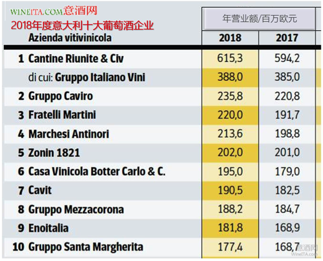 意大利雖然擁有超過10萬家酒莊,但是95%以上的酒莊年產量都在10萬瓶以下,即使是意大利排名前十大的企業,除了GIV集團年產值超過3億歐元,其余9家的產值都在2.5億歐元以內。意大利的前十大公司經營規模和綜合實力,與法國(拉菲羅斯柴爾德和卡思黛樂集團年產值均超10億美元)、澳大利亞(2019年富邑20億美元產值)、智利(干露超過10億美元)、美國(嘉露超過30億美元)的大型酒業集團規模差距較大。從葡萄酒生產的規模衡量,和國際大型酒商相比,意大利葡萄酒產量最大的Caviro集團年產量也只能排在全球第15位。