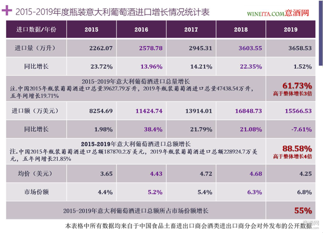 為了方便業內人士更好的理解意大利酒近五年來的成長,意酒網將2015-2019年中國進口瓶裝葡萄酒統計數據重新整理,將五年來意大利葡萄酒的進口量、進口額、均價和市場份額進行對比,得出上圖的2015-2019年度瓶裝意大利葡萄酒進口增長統計表。
