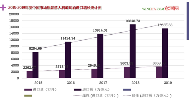 2019年度意大利瓶裝葡萄酒的進口總量為3658 53萬升,進口總額為1 5566億美元,均價為4 25美元 升,占據的6 8%的市場份額。2015-2018年,中國市場瓶裝意大利葡萄酒進口總額連續四年增長,只有2019年度相比2018年度下降7 61%。中國瓶裝葡萄酒進口總量從2015年的39627 79萬升,至2019年的47438 54萬升,五年間增長為19 71%。