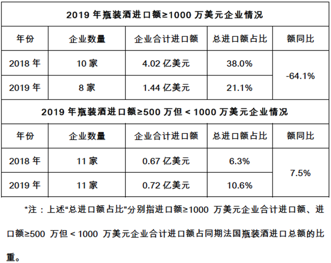 進口法國瓶裝酒頭部企業(指進口額≥500萬美元以上的企業)近兩年數量維持在20家上下,但其2019年進口總額,尤其是≥1000萬美元企業的進口總額,絕對值減少近2.6億美元,出現腰斬式銳減(同比-64.1%)。與之形成對比的是,同期同等量級的澳洲酒進口商數量增加并超過法國,且進口總額亦實現超車。