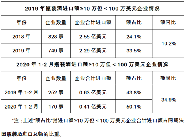 與澳洲一樣,法國瓶裝酒進口商中絕大多數是小型企業(指進口額≥10萬美元但<100萬美元的企業)和微型企業(指進口額<10萬美元的企業),并都在今年1-2月疫情影響下家數減少,且進口總額高幅低開。