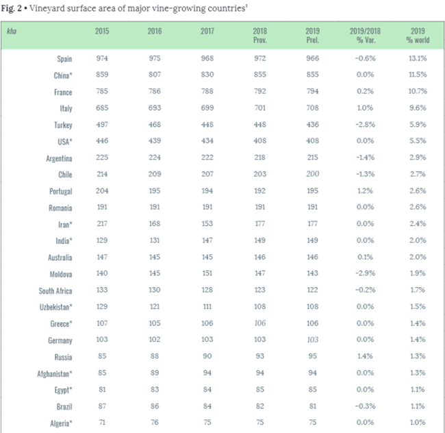 中國葡萄園(855000公頃)的增長似乎放緩,其表面積僅次于西班牙,位居世界第二。