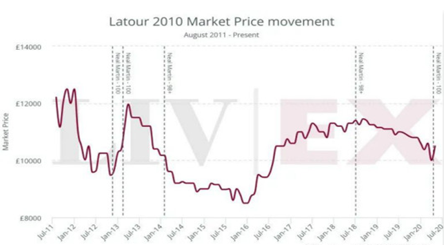 有跌有升,在接下來的幾年,此酒的價格開始隨大市走強而上升。然而,在2018年再次被確認98+分后,價格又再次波動。如今,此酒比其2011年時的前倫敦發(fā)行價(11,000英鎊 每箱12×75)折價5%。