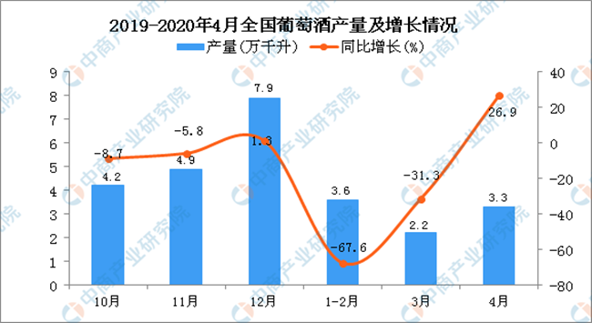 據中商產業研究院數據庫顯示,2020年4月全國葡萄酒產量為3.3萬千升,同比增長26.9%。2020年1-4月全國葡萄酒產量為9.1萬千升,同比下降27.2%。
