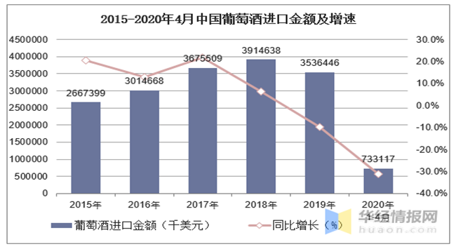 2015-2020年4月中國葡萄酒進(jìn)口金額及增速