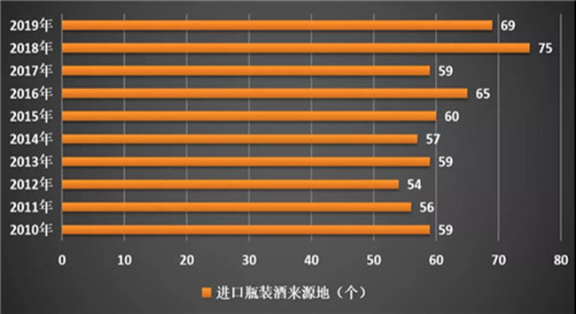 二是進口來源地減少。2020年一季度,瓶裝酒進口來源地為52個。