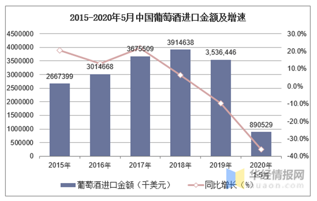 2015-2020年5月中國葡萄酒進(jìn)口金額及增速