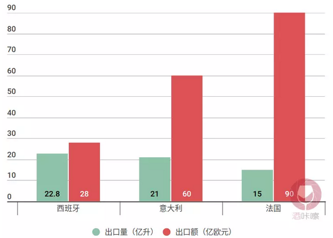 2017,西班牙葡萄酒的出口量超越法國和意大利,位居世界第一,不過盡管西班牙葡萄酒出口量如此龐大,它與意大利和法國葡萄酒所帶給人的印象完全不同,在人們的印象中,西班牙葡萄酒向來價(jià)格便宜,而這一點(diǎn)在其出口額上也能體現(xiàn)。