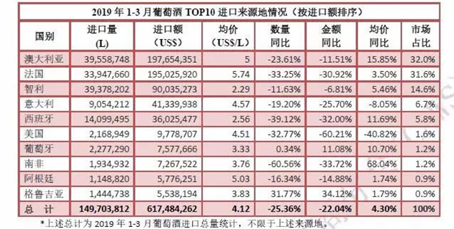 數據是反映市場的晴雨表。2013~2018年上半年我國葡萄酒的進口量逐年遞增,2018年上半年,我國葡萄酒進口量為38.54萬千升,同比增長25.8%。但從下半年開始,局勢發生逆轉,最終,2018年度葡萄酒以68.75億升的進口量收尾,同比下降8.26%,從上面的數據分析可知,2019年一季度下滑態勢仍未扭轉。