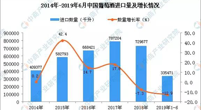 數據顯示,2019年上半年中國葡萄酒進口量為335471千升,與去年同期相比下降12.9%;進口總金額約為14.6億美元。與去年同期相比下降9.2%。