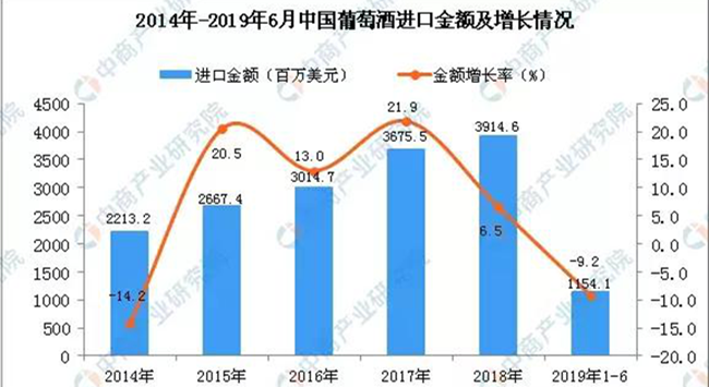 近日,中商產業研究院發布了一份2019年1-6月中國葡萄酒進口數據。以下是今年上半年中國葡萄酒進口數量及金額增長率情況。