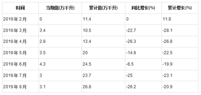 根據中國報告大廳對2019年1-8月全國葡萄酒產量進行監測統計顯示:2019年8月全國葡萄酒產量3.1萬千升,同比下降26.2%,2019年1-8月全國葡萄酒產量為26.8萬千升,累計下降20.9%。