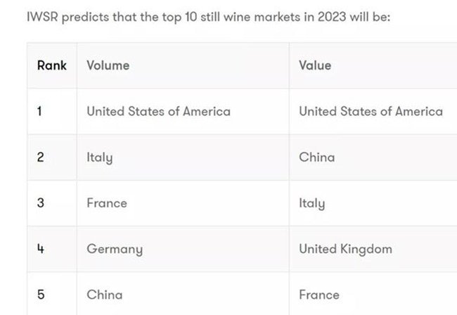 就非氣泡葡萄酒消費(fèi)來說,IWSR預(yù)測(cè)到2023年,全球最大銷量市場(chǎng)依然為美國,意大利、法國、德國以及中國分別二到五位。就價(jià)值來說,中國躍升三位,市場(chǎng)價(jià)值突破170億美元,緊隨美國(350億美元)來到第二名,意大利、英國、法國都進(jìn)入前五。