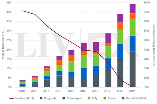 2010年至2019年(至今)在Liv-ex上的酒區(qū)市場份額